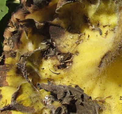 После цветения на тыльной стороне корзинок подсолнечника появляются темные пятна. Через некоторое время на фронтальной стороне корзинки между семенами появляется серый мицелий гриба. При этом ее ткань становится твердой.