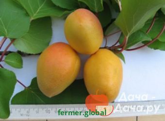 Включен в Госреестр по Северо-Кавказскому (6) региону. Раннего срока созревания, универсального назначения. Дерево среднее. Крона средней густоты, раскидистая. Побеги средние, прямые, красно-коричневые, голые. Листья крупные, широкояйцевидные, гладкие, матовые. Плоды крупные со средней массой 45г, одномерные, треугольной формы. Основная окраска плода желтоватая, покровная - розовая, равномерно размытая. Кожица средней грубости, опушена слабо, бархатистая. Мякоть светло-оранжевая, средне сочная, слитно-волокнистая, кисло-сладкого вкуса. Дегустационная оценка вкуса 4,6 балла. Косточка отделяется от мякоти хорошо. В плодах содержится: сахара - 10,5%, кислоты - 1,4%, витамина С - 6,6мг%. Средняя урожайность 100 ц/га. Зимостойкий. Транспортабельность плодов хорошая.